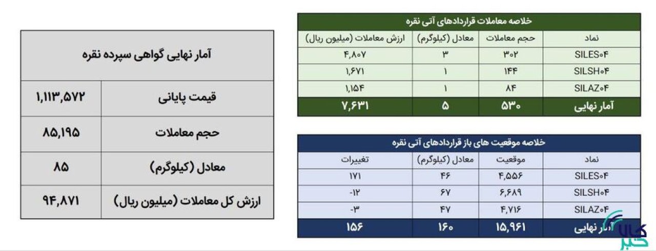 خلاصه معاملات بازار نقره در روز گذشته نشان میدهد که در این روز 85 هزار و 195 گواهی معادل 95 کیلوگرم شمش نقره به ارزش 9.5 میلیارد تومان دادوستد شد.