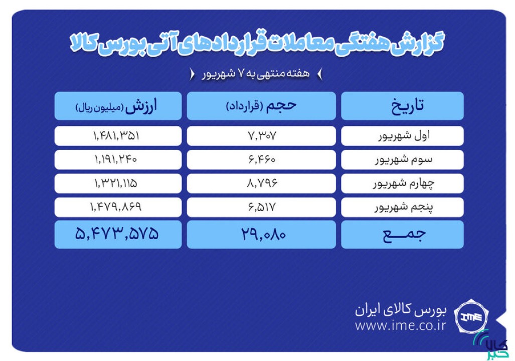 بررسی روند معاملات قراردادهای آتی بورس کالای ایران درهفته منتهی به ۷ شهریور نشان می دهد که در هفته گذشته ارزش معاملات بازار آتی به بیش از ۵۴۷ میلیارد تومان رسید.