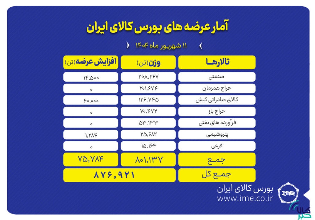 امروز قرار است 80 هزار و 99 تن محصول شامل 35 هزار تن لوب کات، 26 هزار و 966 تن مواد پلیمری، 8 هزار و 500 تن گوگرد، 4 هزار و 200 تن قیر، 2 هزار و 158 تن فرآورده های نفتی در تالار پتروشیمی و فرآورده های نفتی عرضه شود.