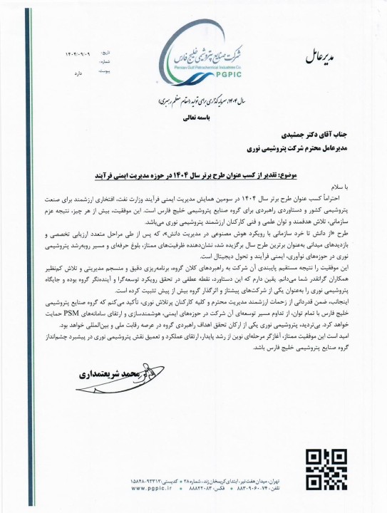«کسب عنوان طرح برتر سال 1404 در سومین همایش مدیریت ایمنی فرایند وزارت نفت افتخاری ارزشمند برای صنعت پتروشیمی کشور و دستاوردی راهبردی برای گروه صنایع پتروشیمی خلیج فارس است. این موفقیت بیش از هر چیز نتیجه عزم سازمانی، تلاش هدفمند و توان علمی و فنی کارکنان ارزشمند پتروشیمی نوری میباشد.